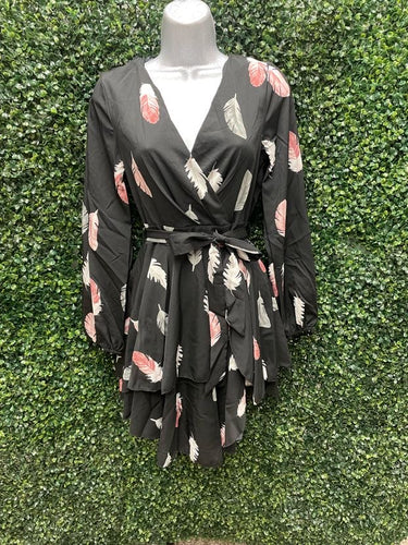 Women's Feather Print V-Neck Dress with Belt – Junior Fit